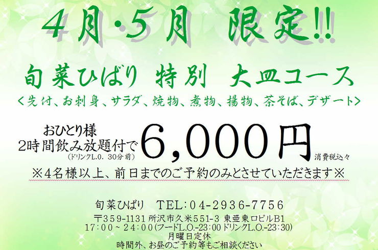 2019/05/05こんにちは! 所沢、旬菜ひばりです˙ᵕ˙ 長い長いGW みなさんどうお過ごしでしたでしょうか? 家族でお出かけできた方も おうちでのんびりした方も いつもと変わらず仕事だわ!! という方も あさってからは また日常が戻ってきますね! さてご好評いただいてる 4・5月限定大皿コース ですが リニューアルに伴い 4名様以上でご利用いただけるようになりまし... -